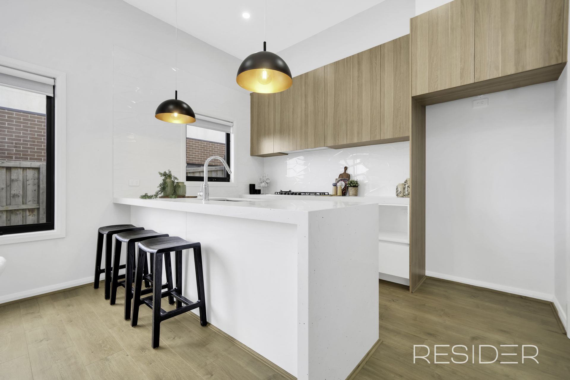 The bright open-plan living and meals area with high ceilings sits at the heart of the home, complemented by a sleek designer kitchen featuring 900mm stainless steel appliances, a walk-in pantry, stone benchtops, and a dishwasher. Whether you're preparing dinner or entertaining guests, everything is right where it should be.
