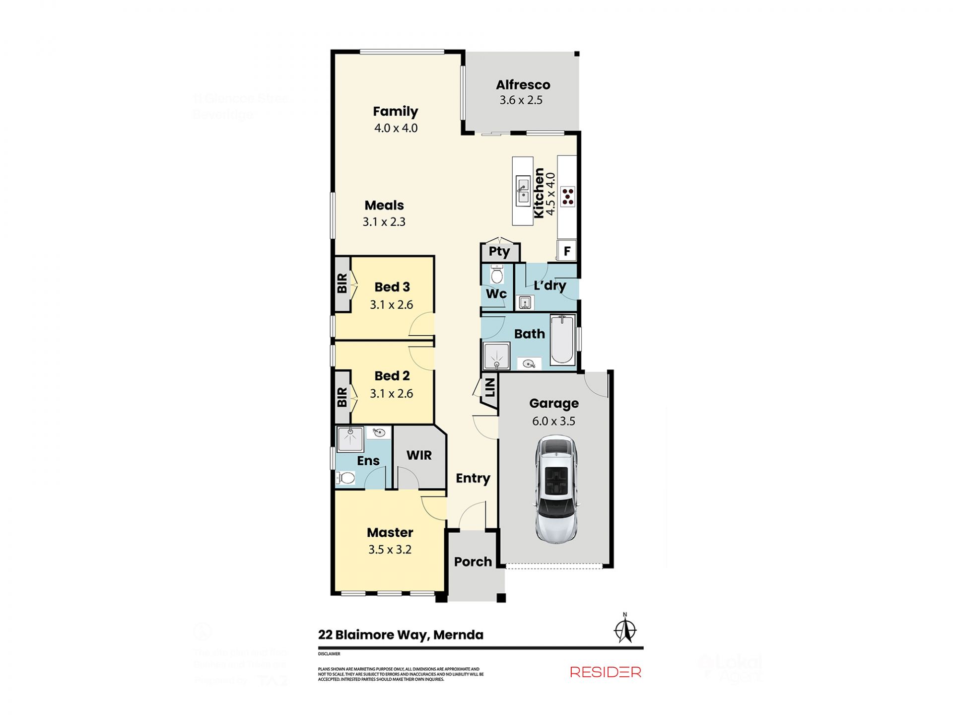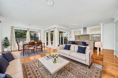 The floor plan offers a master bedroom with walk-in robe and ensuite, two additional bedrooms with built-in robes, a central bathroom and separate powder room. A light-filled open-plan living zone incorporates a kitchen with stone benchtops, 900mm cooker and dishwasher, meals area and lounge, opening onto a north-facing rear yard with private entertaining space.
