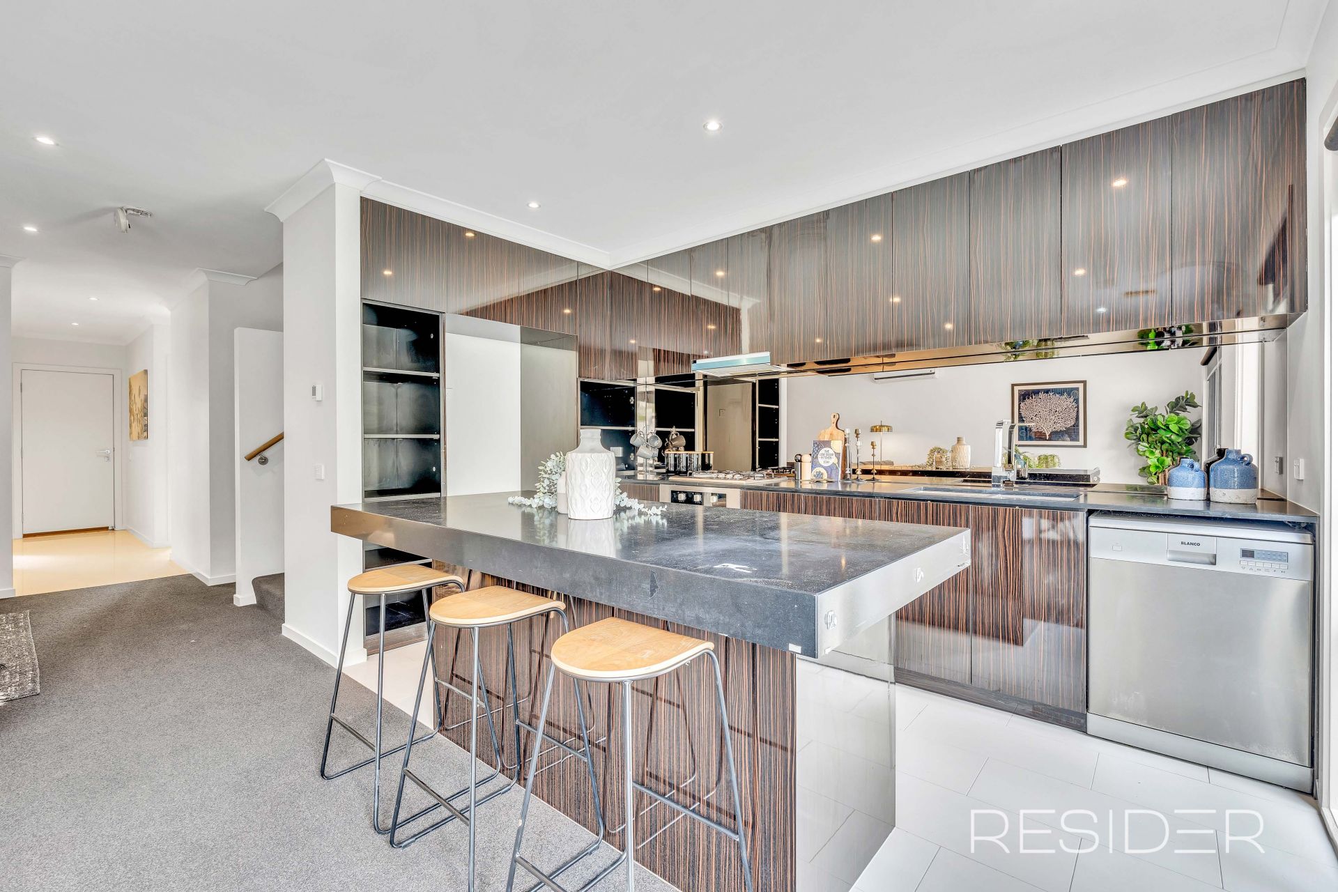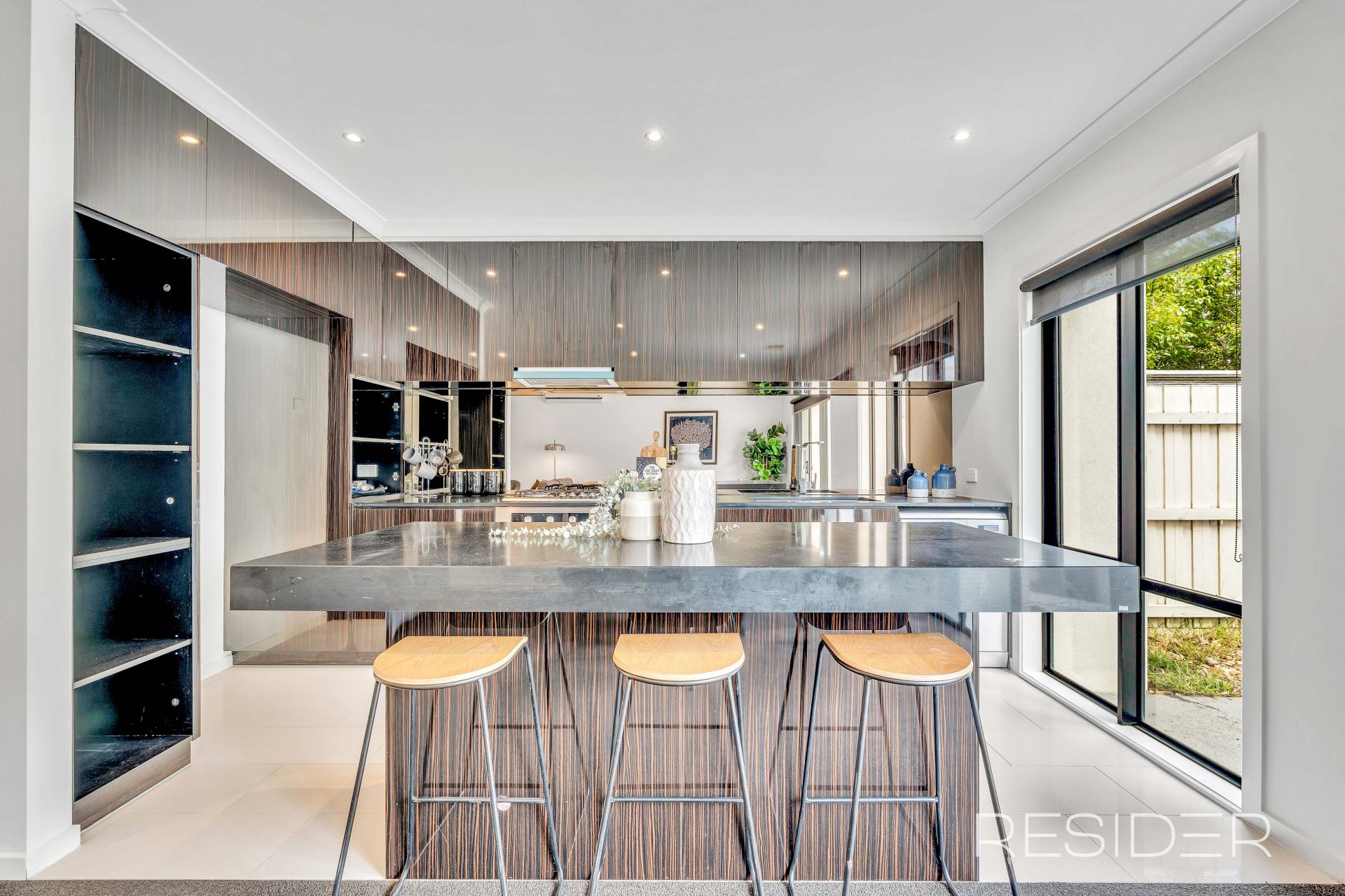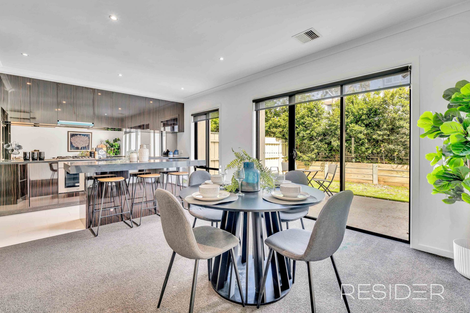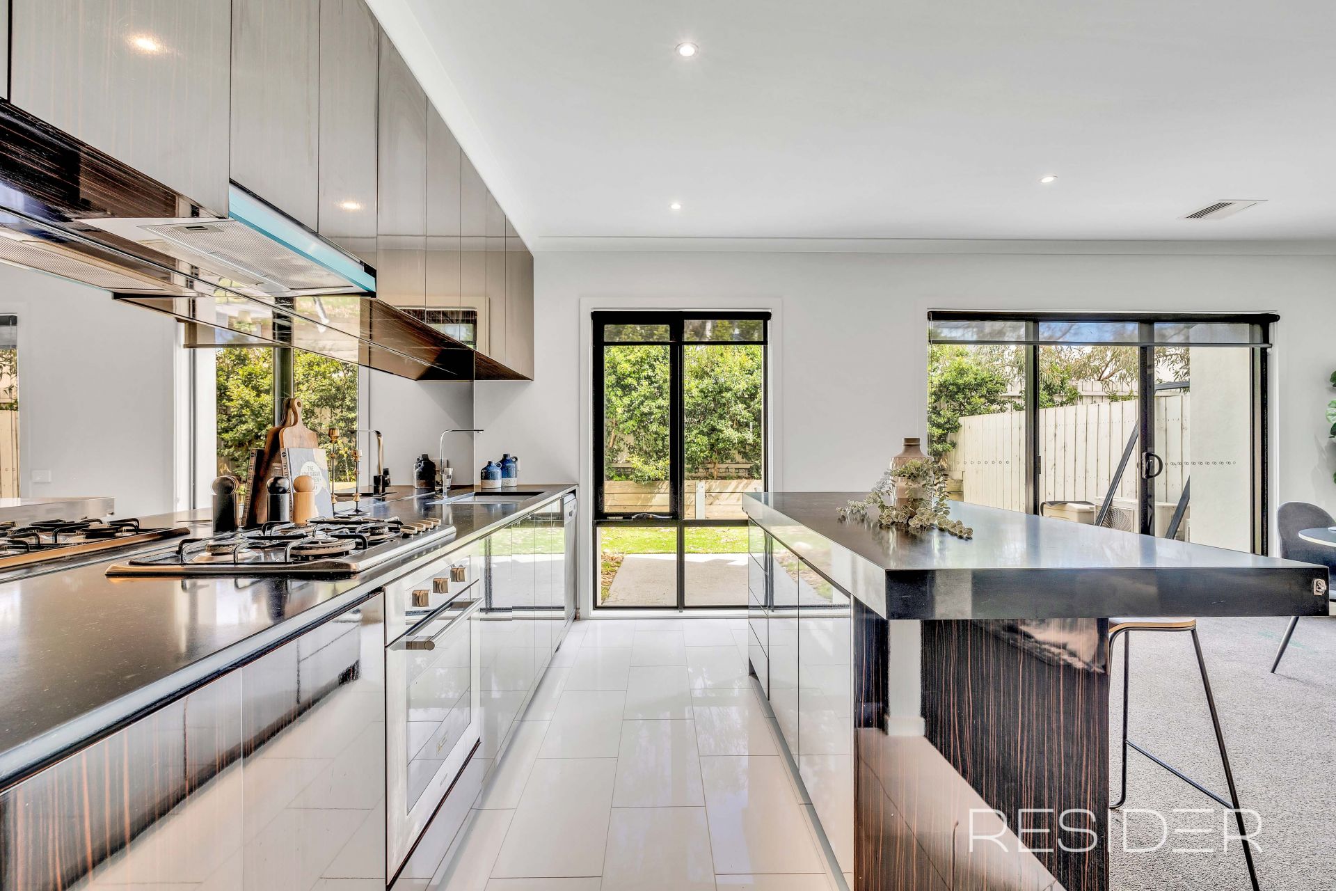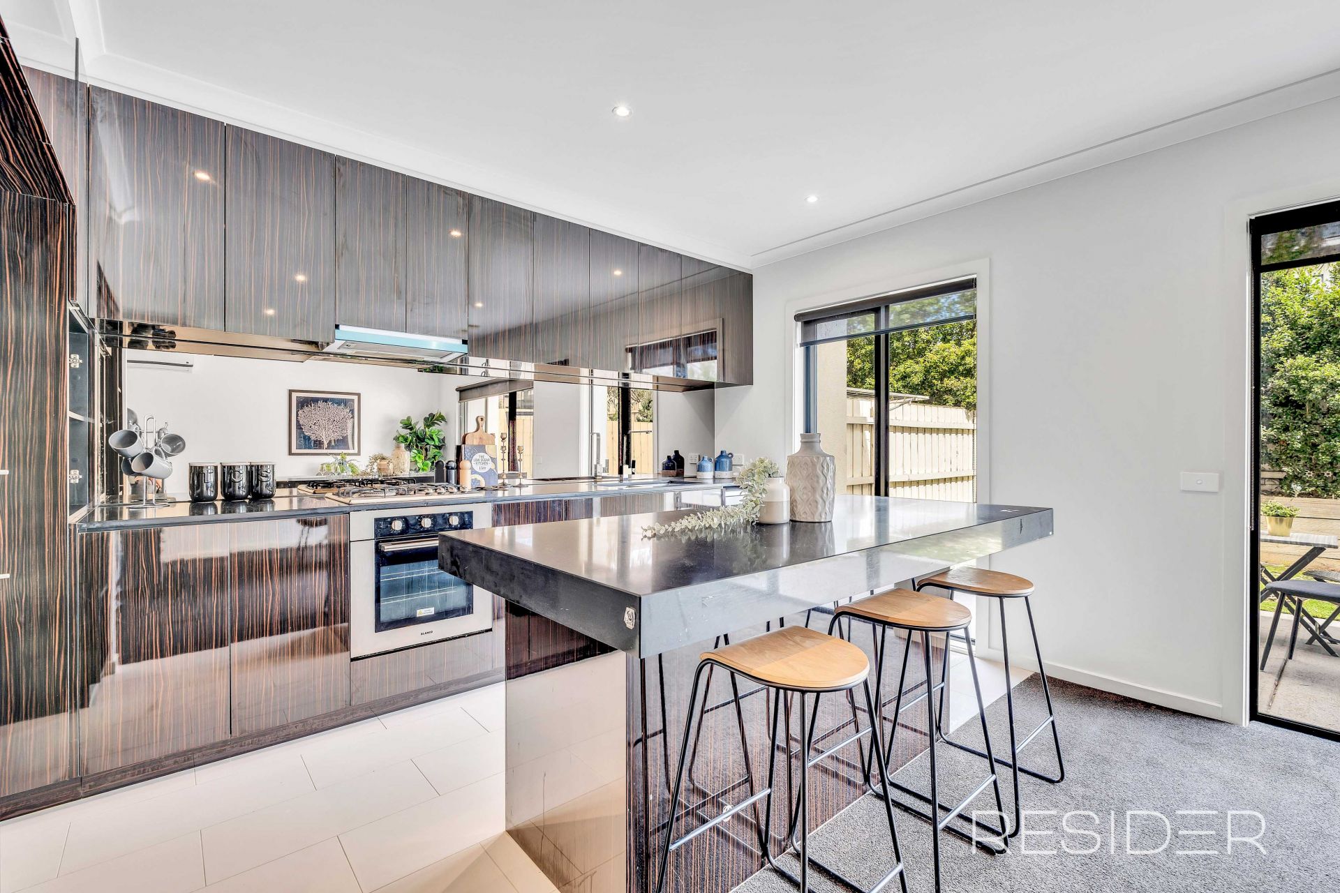 The modern kitchen is fitted with striking black marble stone benchtops and quality stainless steel Euro appliances, opening to a bright open-plan living and dining zone that seamlessly connects to the outdoor area.