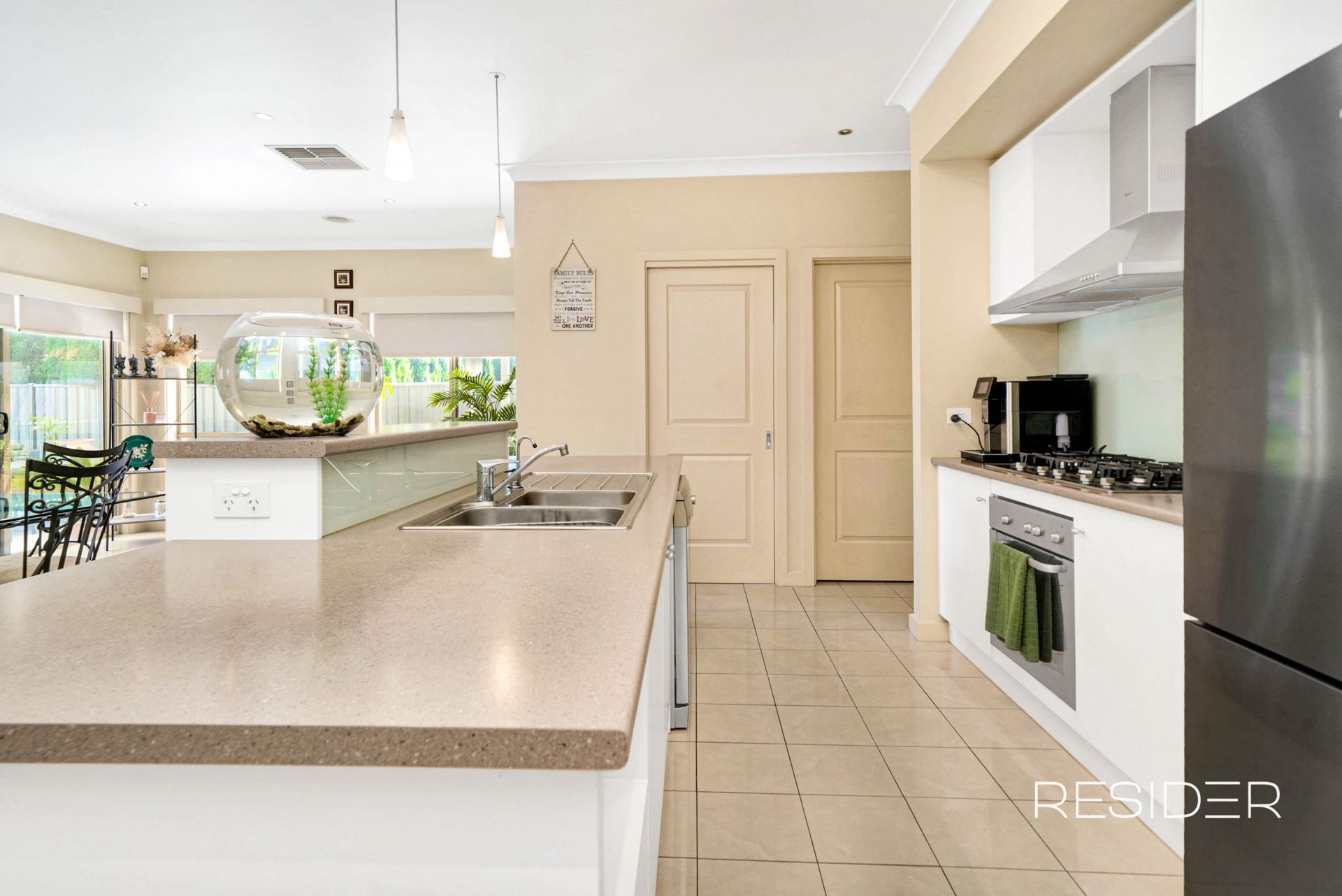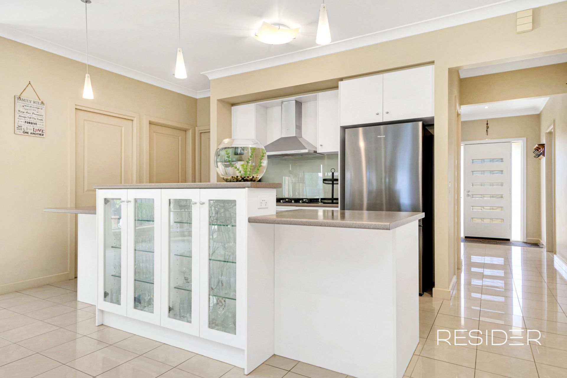 At the heart of the residence, the warm-toned kitchen combines classic style with functional design, perfect for both daily living and entertaining. An elegant island bench with delicate glass cabinetry takes centre stage, complemented by quality stainless steel appliances including a dishwasher, and a generous walk-in pantry.